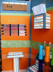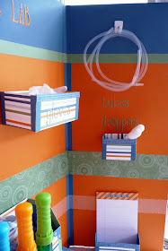 I used a scrap piece of cork for the note board. The "probes" are knitting needles that I found on clearance for 99 cents for the whole set. The "specimen" tray is a mini shoe box lid.